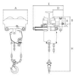 | Produkto kodas | Kėlimo galia, t | Valdymo grandinė vežimėlio, Øxmm | Sijos plotis, mm | Min. spindulys, m | A, mm | B, mm | C, mm | D, mm | E, mm | H, mm | R, mm |